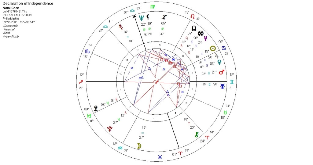Without foreign aid – in particular, France’s material supply and amphibious military support – the Revolutionary cause would have been lost. This acknowledgment has largely faded from today’s collective consciousness, and we are now out of touch with our foreign policy and oblivious to U.S.’ military and intelligence covert operations overseas [Scorpio and Sagittarius 12th house]. U.S.’ attempt to maintain leadership and moral posture [Capricorn] jeopardized democracy at home and around the world, and kept the pursuit of ambiguous “national interest” out of the public eye and into the shadows of unaccountability and hypocrisy.